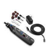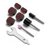 - Setje inclusief opzetstukjes, grote schuurwalsbevestiging, 3 schuurwielen, klein schuurtrommel opzetstuk met 2 schuurwielen, afwerking steen, moersleutel, USB oplader.